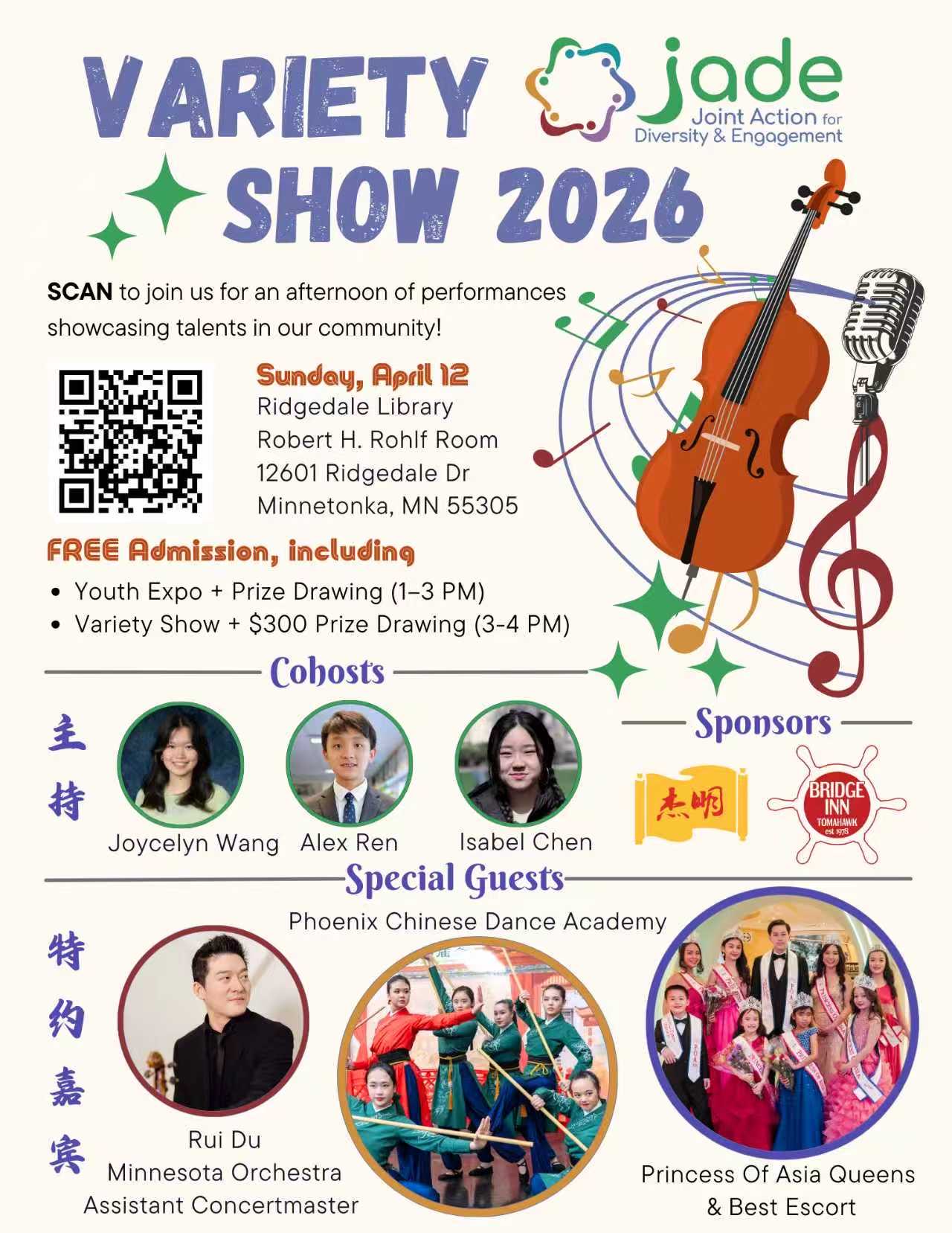 我们诚挚邀请您和家人于 2026年4月12日下午 参加在 Minnetonka Ridgedale Library 举办的 JADE青少年活动博览会与综艺表演。这是一场面向华裔家庭的社区活动,为家长和孩子提供一个探索课外活动、结识朋友、获取资源、增进亲子互动的交流平台。