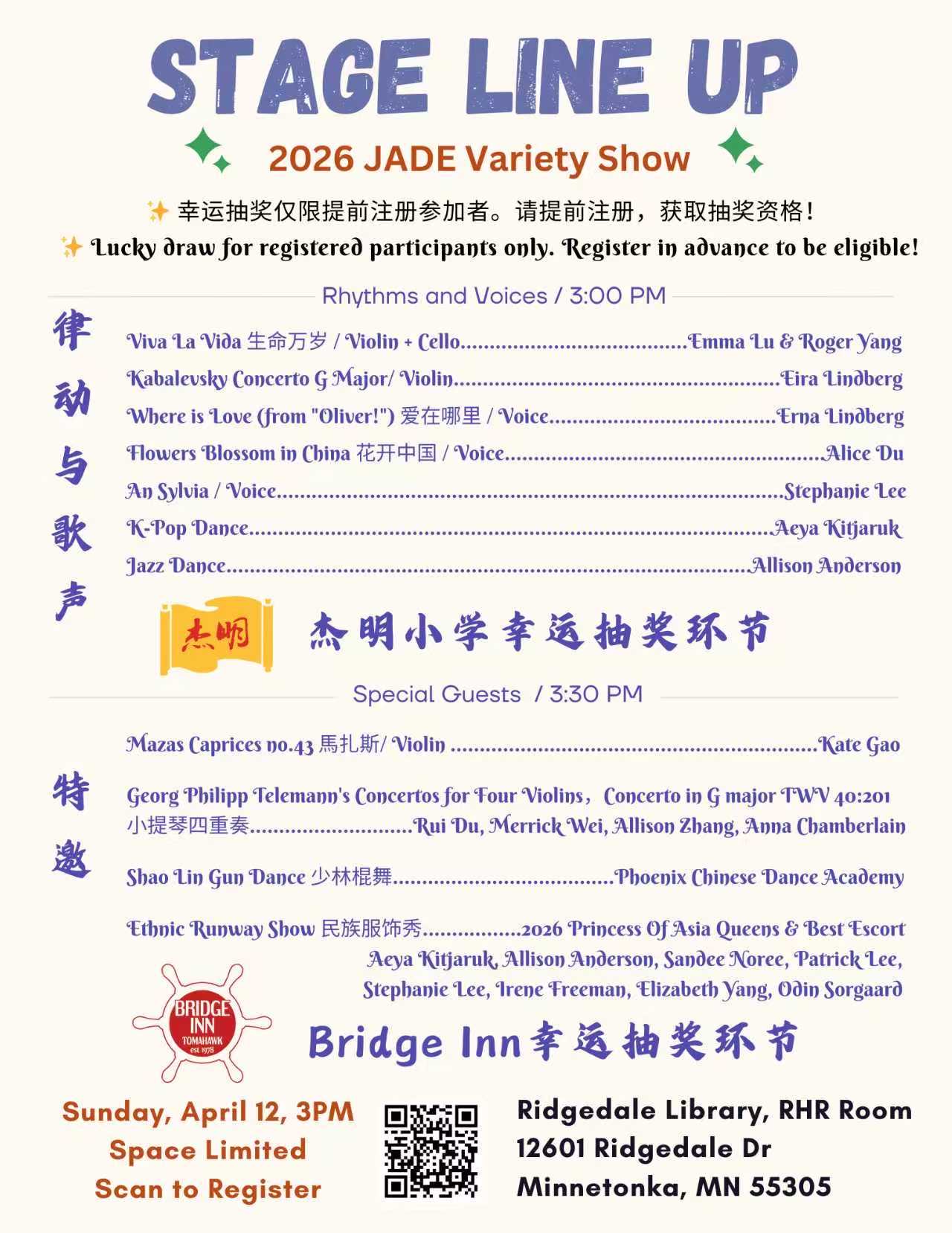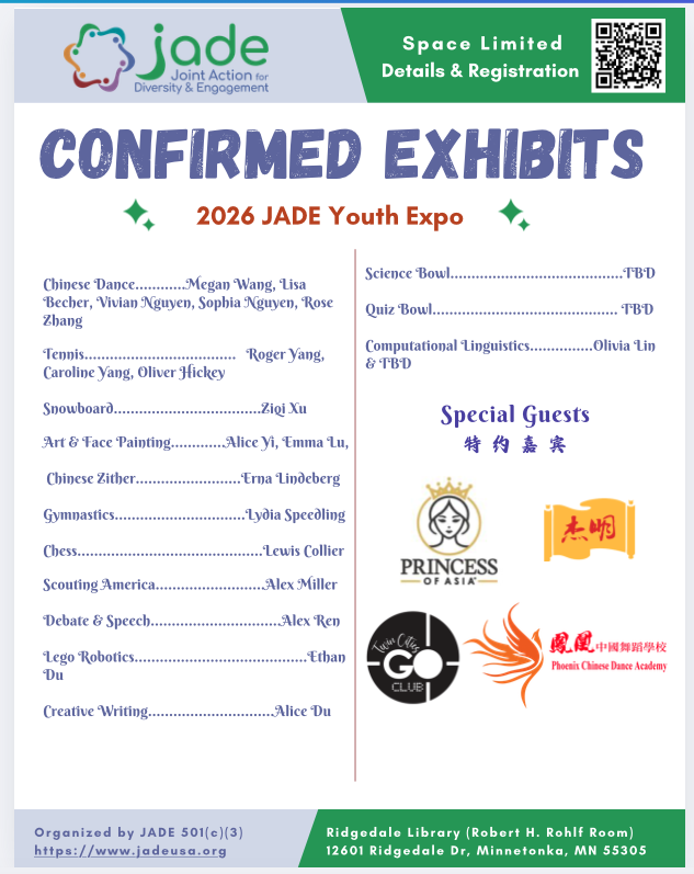 我们诚挚邀请您和家人于 2026年4月12日下午 参加在 Minnetonka Ridgedale Library 举办的 JADE青少年活动博览会与综艺表演。这是一场面向华裔家庭的社区活动,为家长和孩子提供一个探索课外活动、结识朋友、获取资源、增进亲子互动的交流平台。